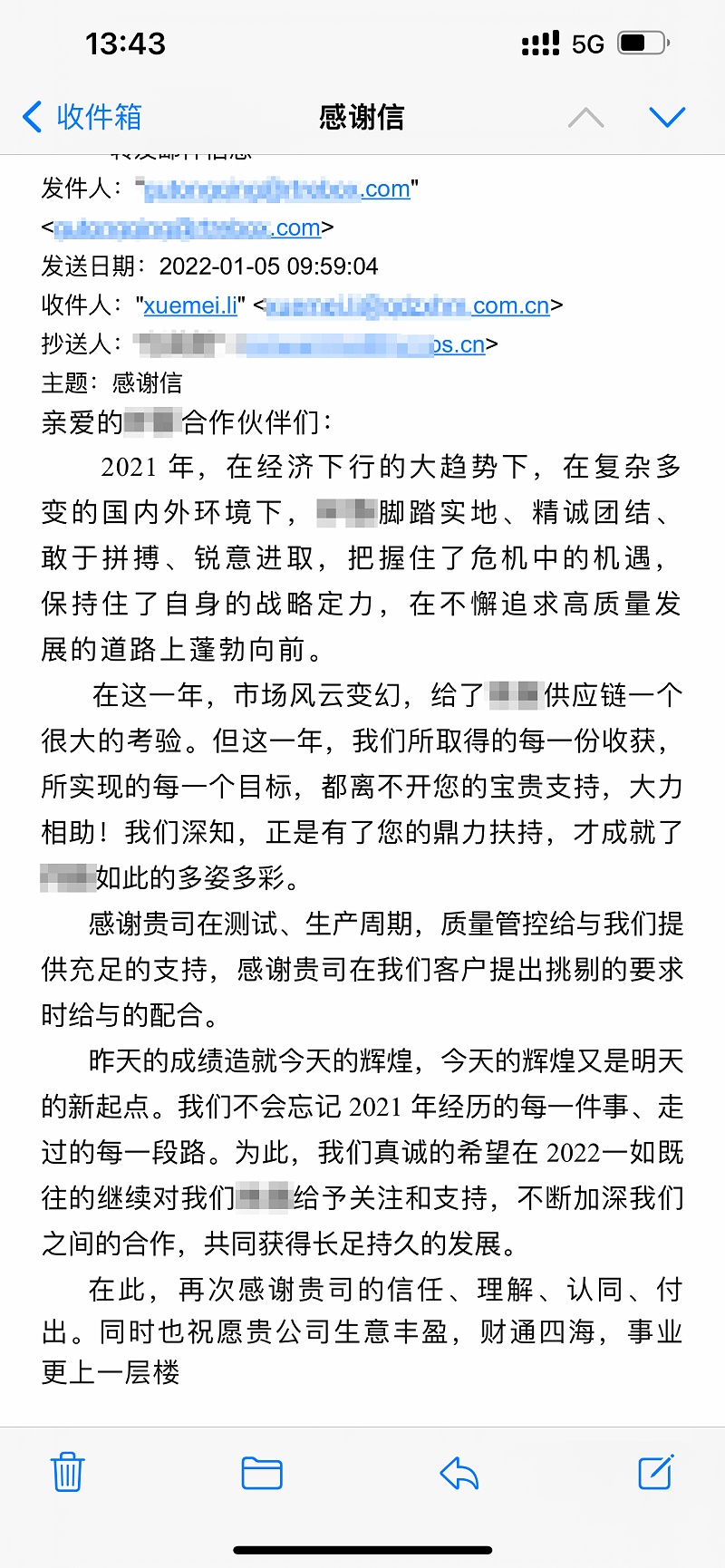 無(wú)論是收到感謝信還是獲評(píng)優(yōu)秀供應(yīng)商,我們都深感欣慰,感謝我們的戰(zhàn)略合作伙伴和客戶(hù)朋友對(duì)我們工作的充分認(rèn)可和高度贊許,讓我們內(nèi)心充滿(mǎn)感動(dòng)。這既是對(duì)我們2021年工作的肯定與見(jiàn)證,也將激勵(lì)我們?cè)?022年繼續(xù)加油!